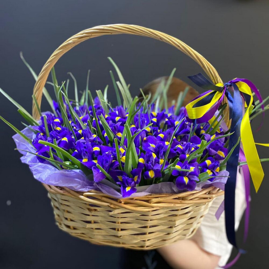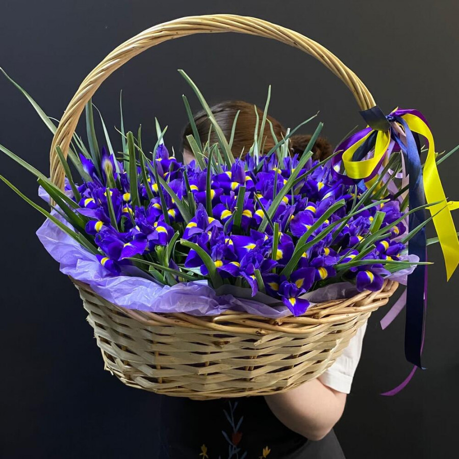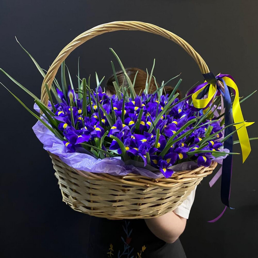 101 синий ирис в плетенной корзине в Набережных Челнах