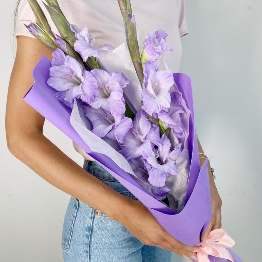 На фото букет из 3 сиреневых гладиолусов. В составе: гладиолус 3 шт, дизайнерская упаковка 1 шт, атласная лента 2 шт, . Все цветы свежие и ароматные, букет красиво оформлен и отлично подходит для подарка. Доступна доставка цветов или самовывоз.