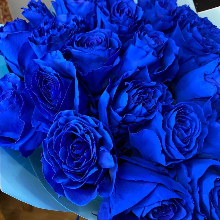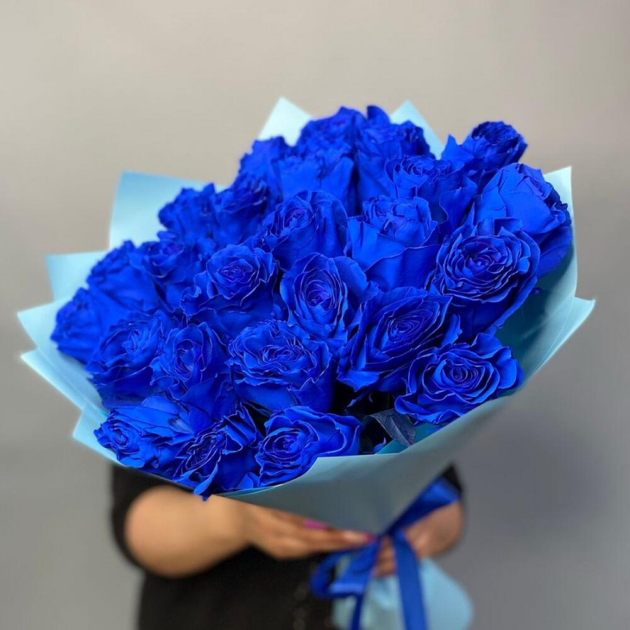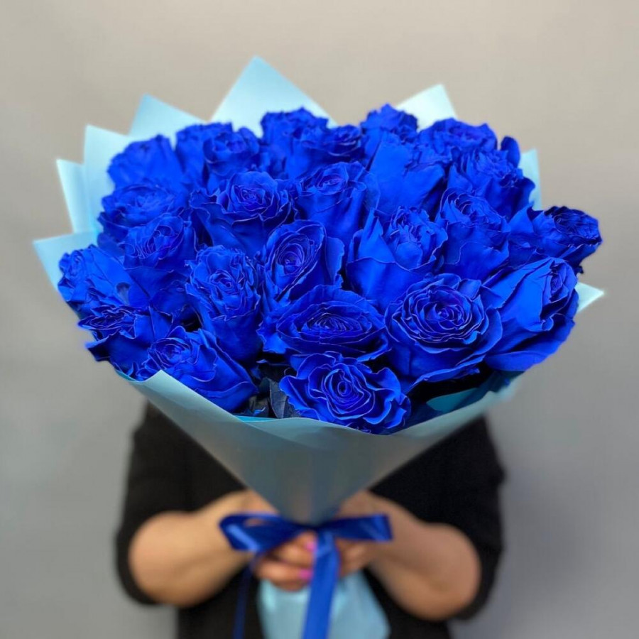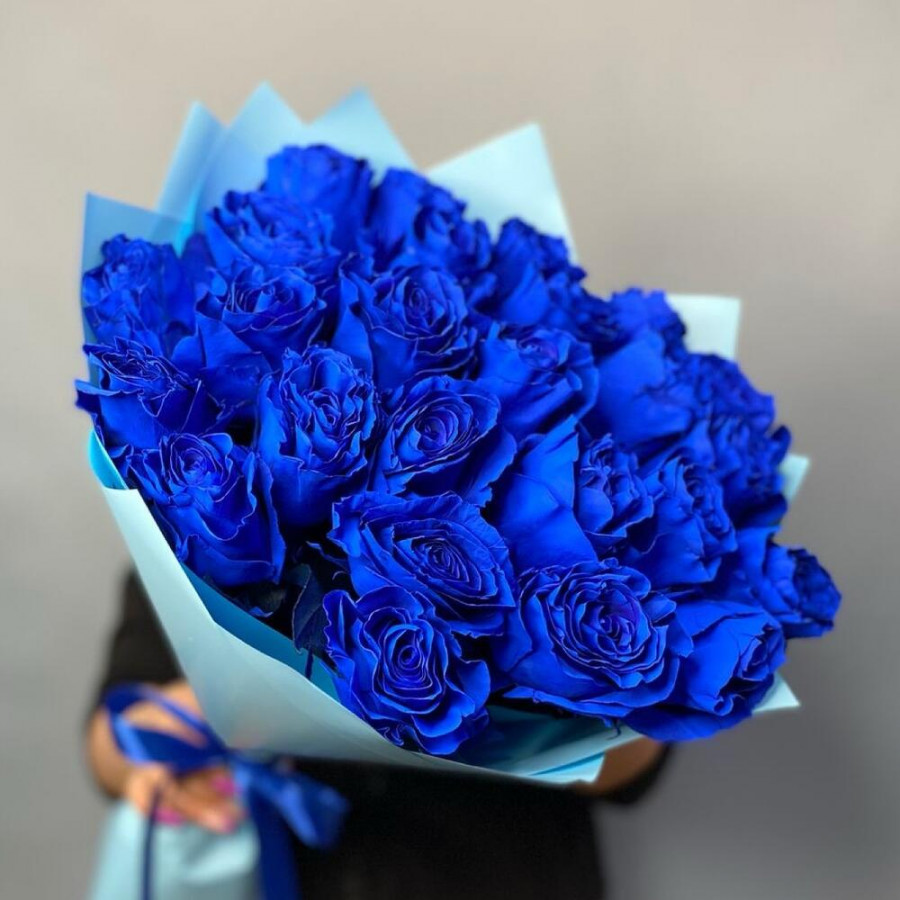 На фото букет из 25 синих роз. В составе: роза (синяя) 25 шт, дизайнерская упаковка 1 шт, атласная лента 1 шт, . Все цветы свежие и ароматные, букет красиво оформлен и отлично подходит для подарка. Доступна доставка цветов или самовывоз.
