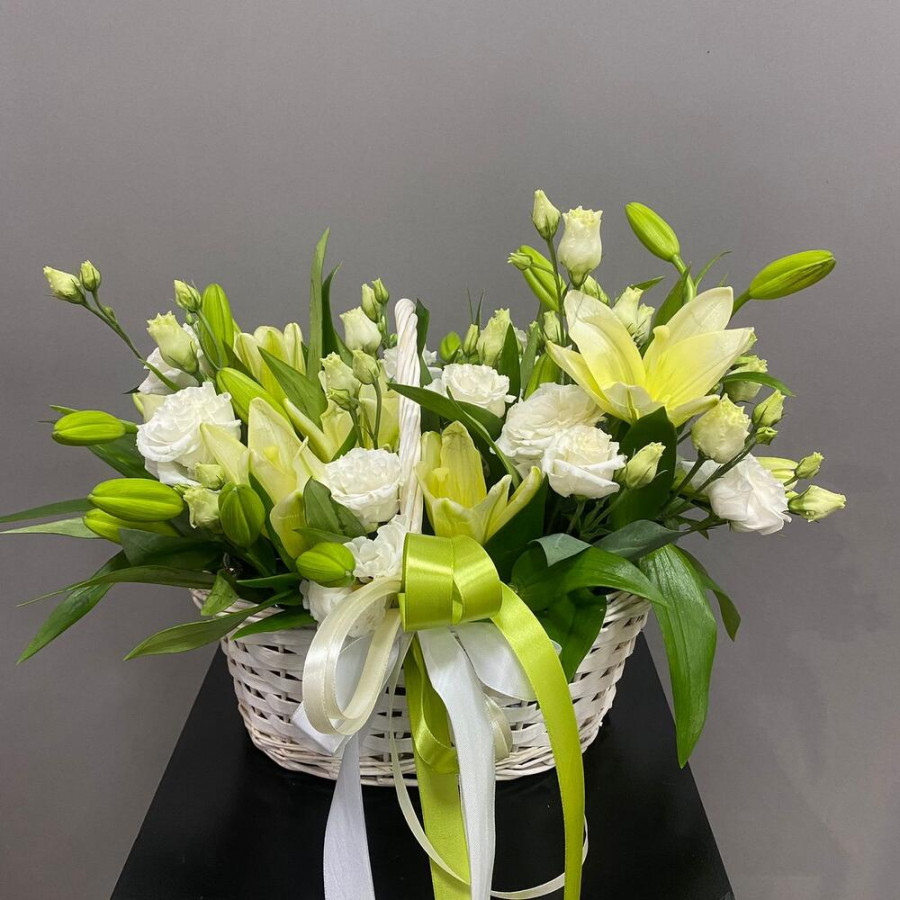 Корзина с белыми лилиями и эустомами в Набережных Челнах